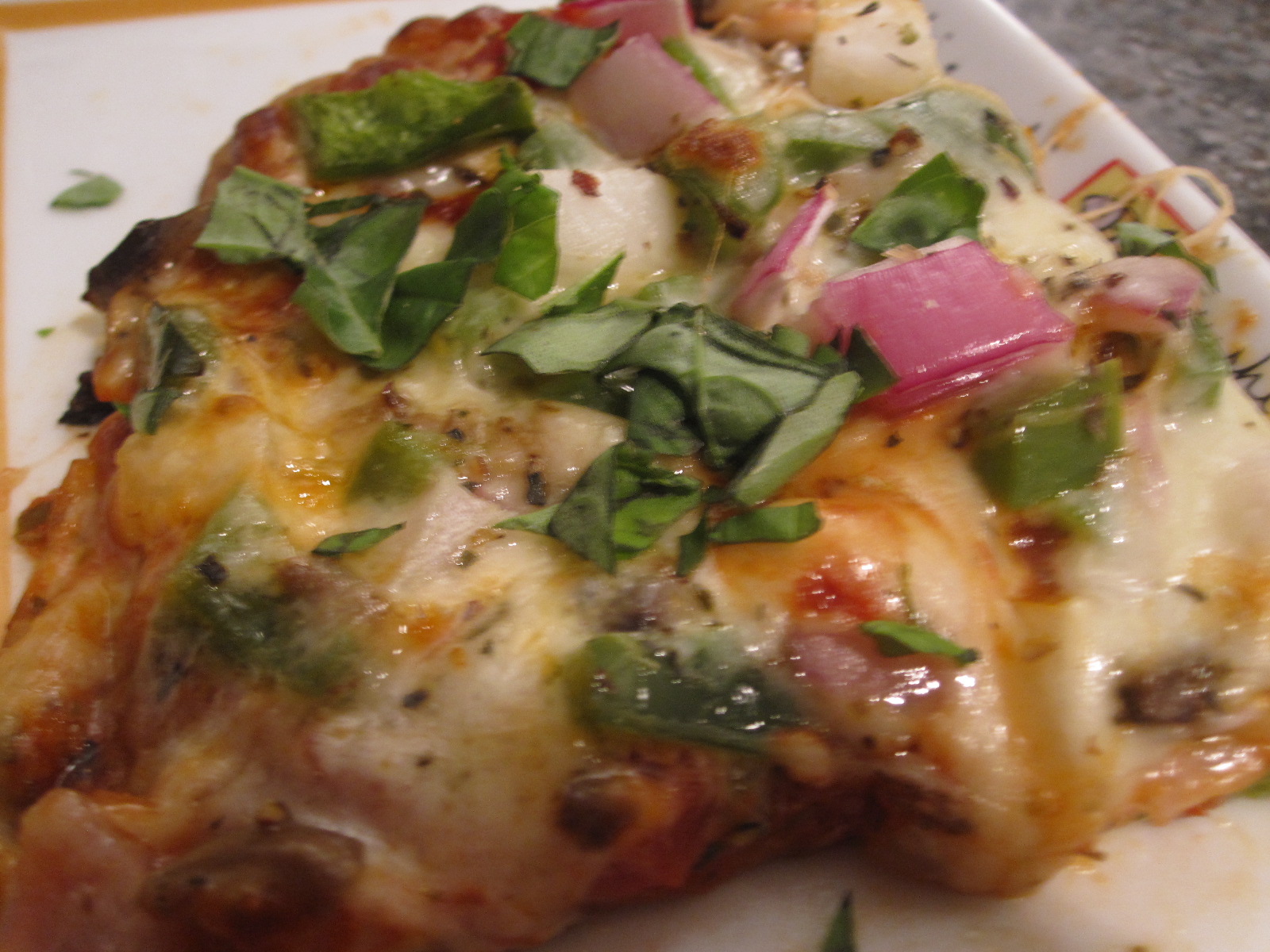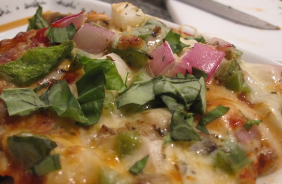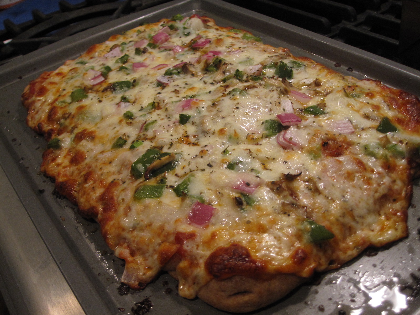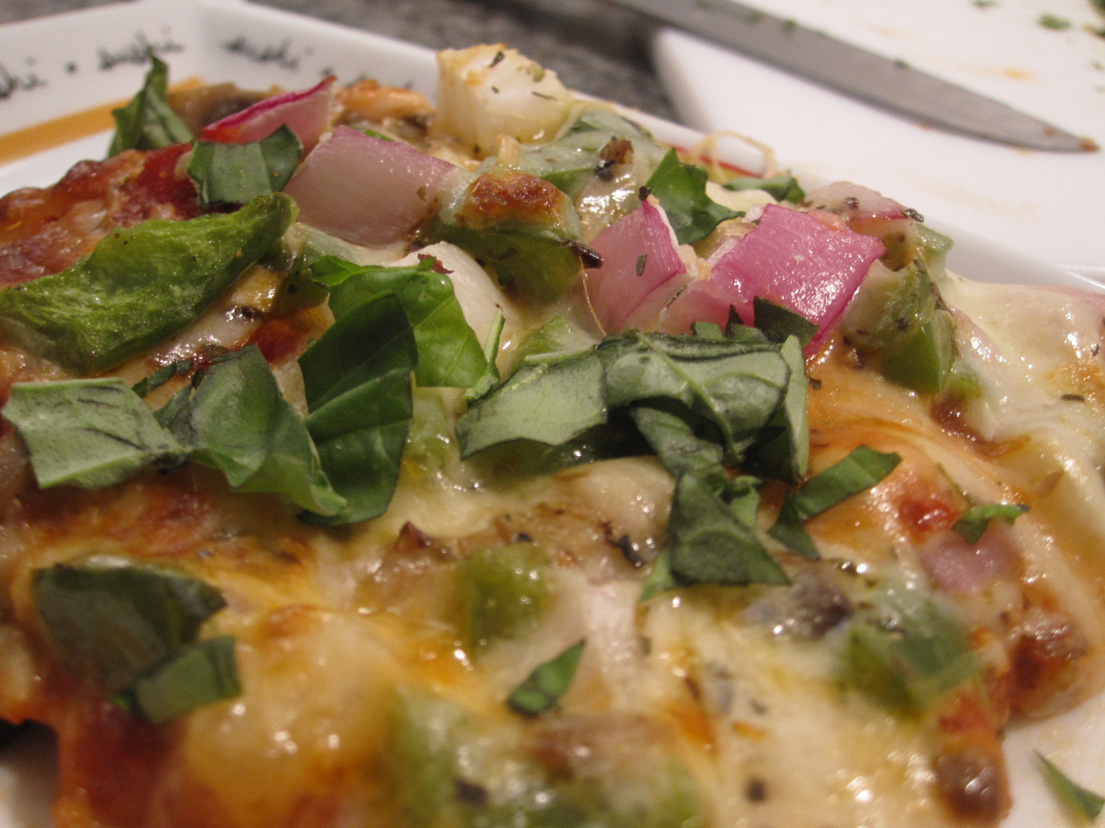 until i get a stand mixer, i won’t be doing any REAL baking or dough-making, unless i feel like attempting an adventure. packaged baking mixes and premade pizza doughs will have to do! i loove trader joe’s pizza dough. i picked up a bag (only ¢99!) of their whole wheat dough a few days ago and decided last night i should probably use it up, so i made pizza! it wasn’t REALLY cooking, it was more like assembling. but still, the pizza was homemade and not the ¢99 stuff from downstairs. not that there’s anything wrong with it, ¢99 pizza is delicious. but this one was better 🙂 AND it was on a whole wheat crust! you can’t get THAT for ¢99.