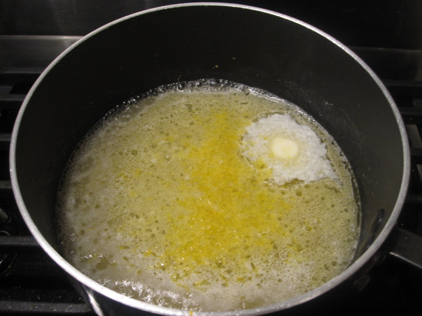 - add the broth and lemon zest. add a bit of salt and pepper. let come to a boil.