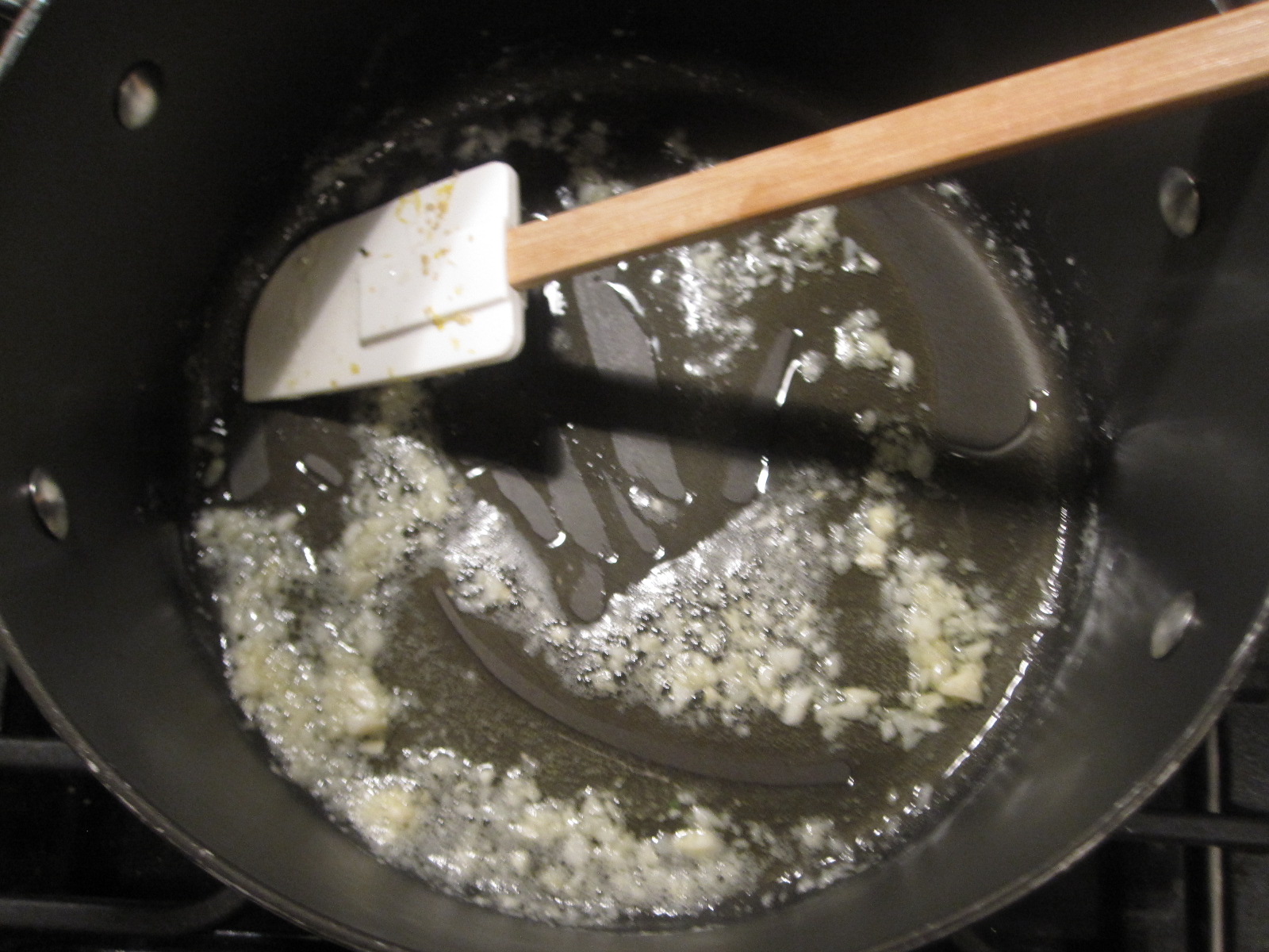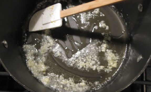 - saute the garlic in olive oil over medium heat for about 30 seconds to a minute, until it smells good.