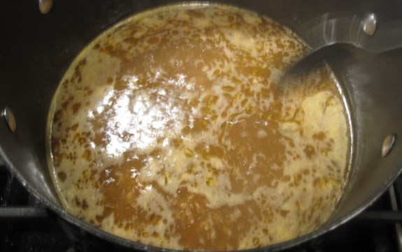 - pour broth into the pan with the butter, shrimp-cooking-remnants and garlic.