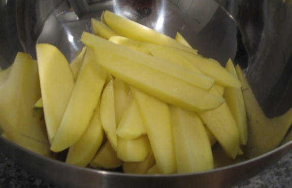 peel and cut up some potatoes, trying to keep them around the same size. i used 3.