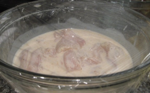 cut the chicken into strips and toss in the marinade. cover and refrigerate for at least 30 min up to 8 hours.