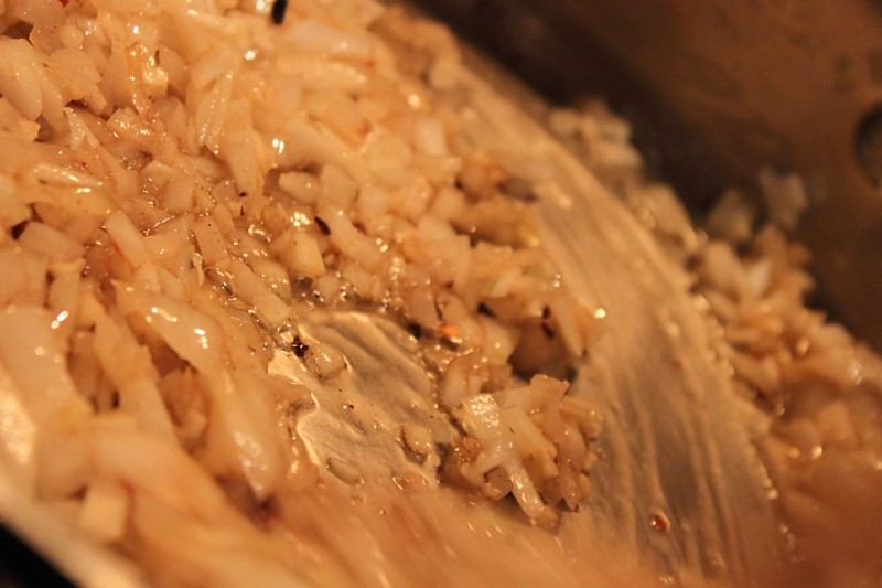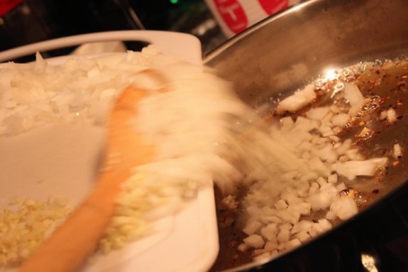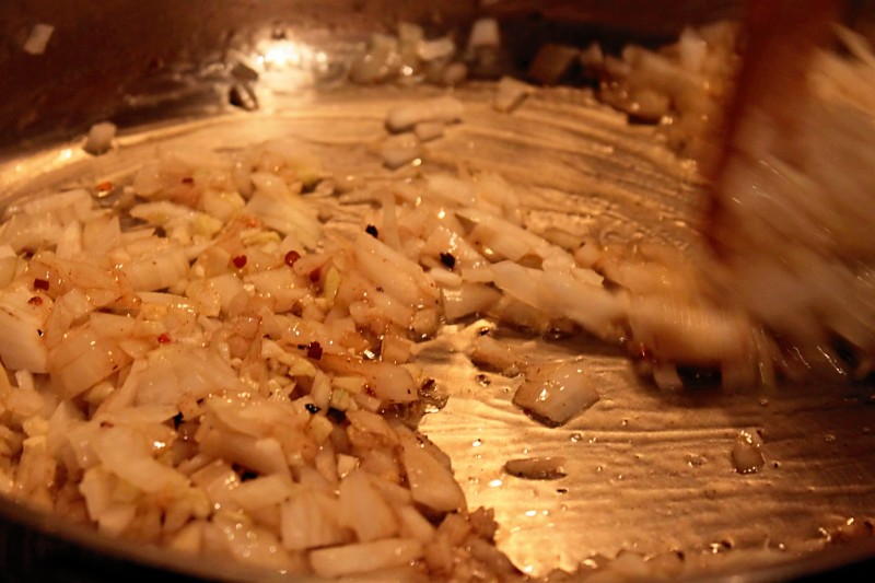 - add onions and garlic, cook for a min and then add red pepper flakes to taste (i’d recommend at least a teaspoon for spicy)