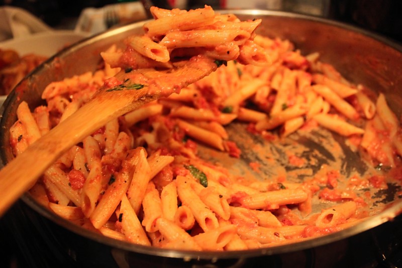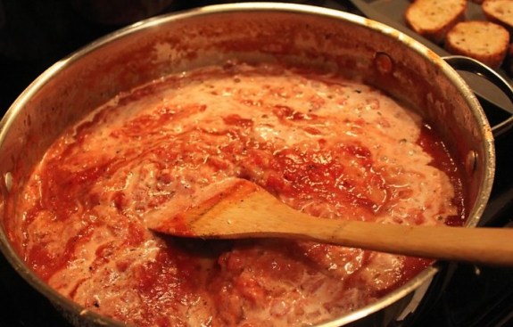 - add vodka, cook until reduced by about half or until you think the alcohol is cooked out