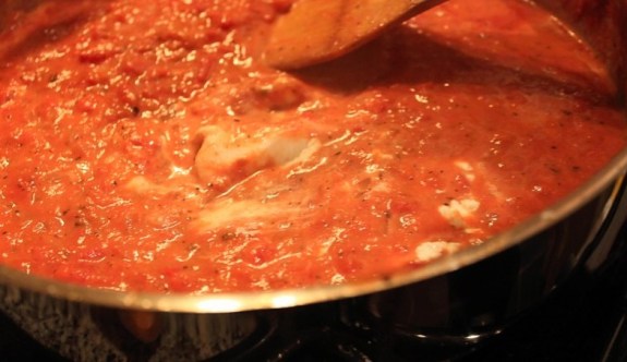 then add 1 28 oz can of crushed tomatoes and a few glugs of chicken broth. also salt, and any italian dried seasonings you have – oregano, basil, thyme, etc)